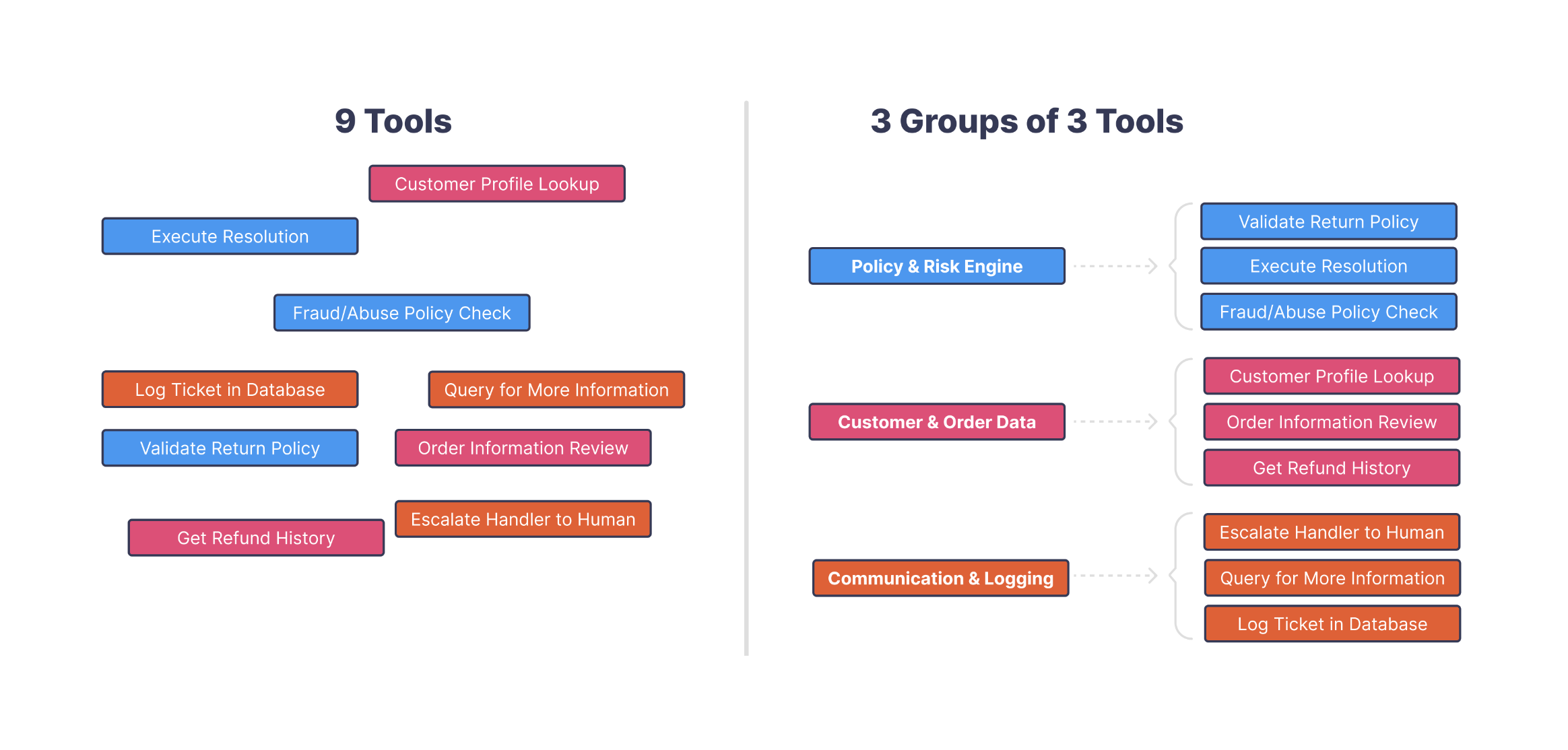 This agent had to modify dozens of different account attributes—names, addresses, roles, preferences, notifications, billing details—and for this customer that meant working with over a hundred individual tools. Many of them overlapped in subtle ways. There were different tools for updating first names, legal names, display names, internal labels, and alternate contact fields. The intent was usually obvious, but the mapping from intent → tool was not.