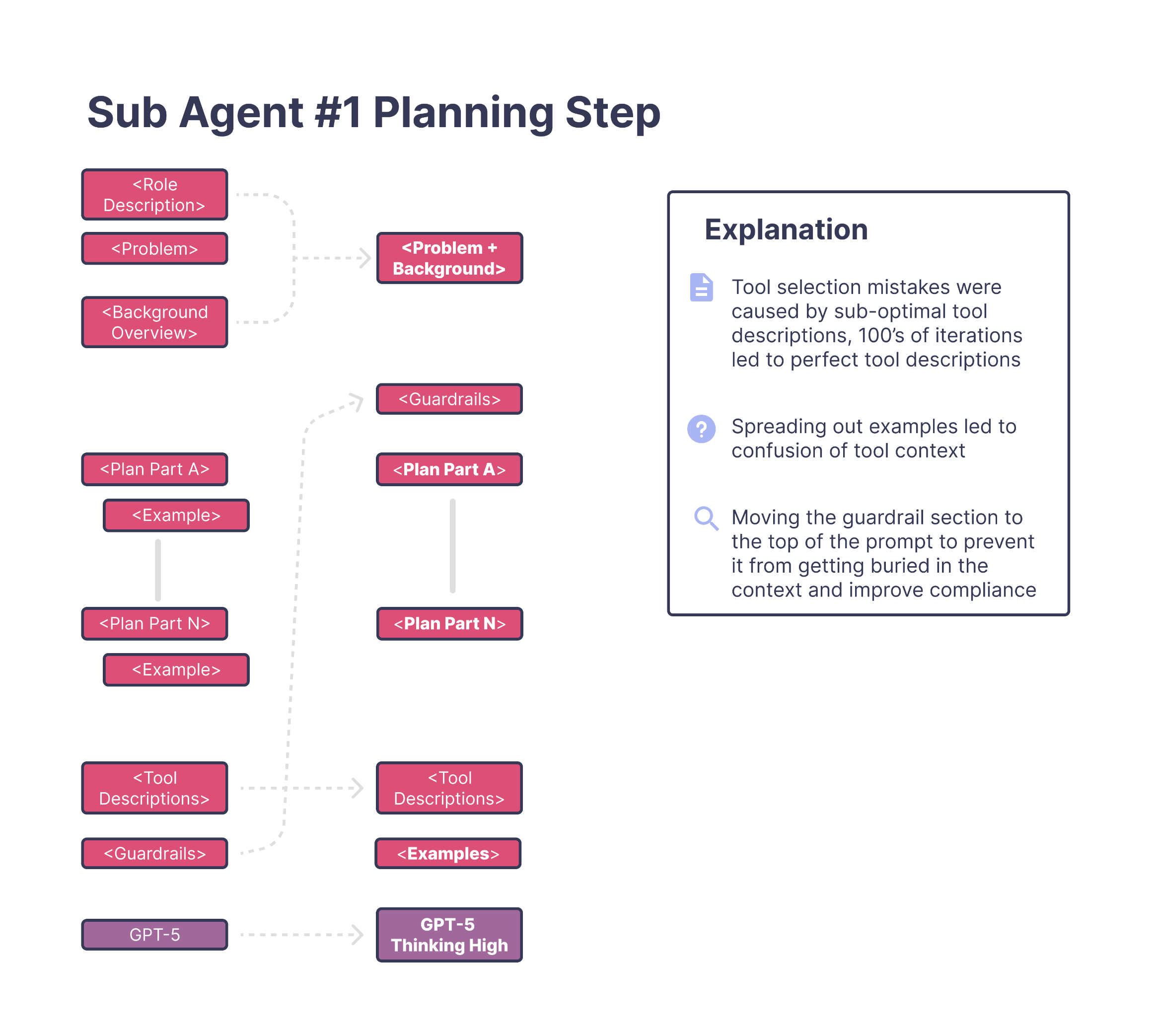 The original planning prompt had grown extremely large. It was split into multiple sections—framing text, a long problem description, a planning overview, several "part A/B/C" blocks, examples, guardrails, and a long list of tools. On paper it looked structured, but in practice it forced the model to interpret too many instruction styles at once.
