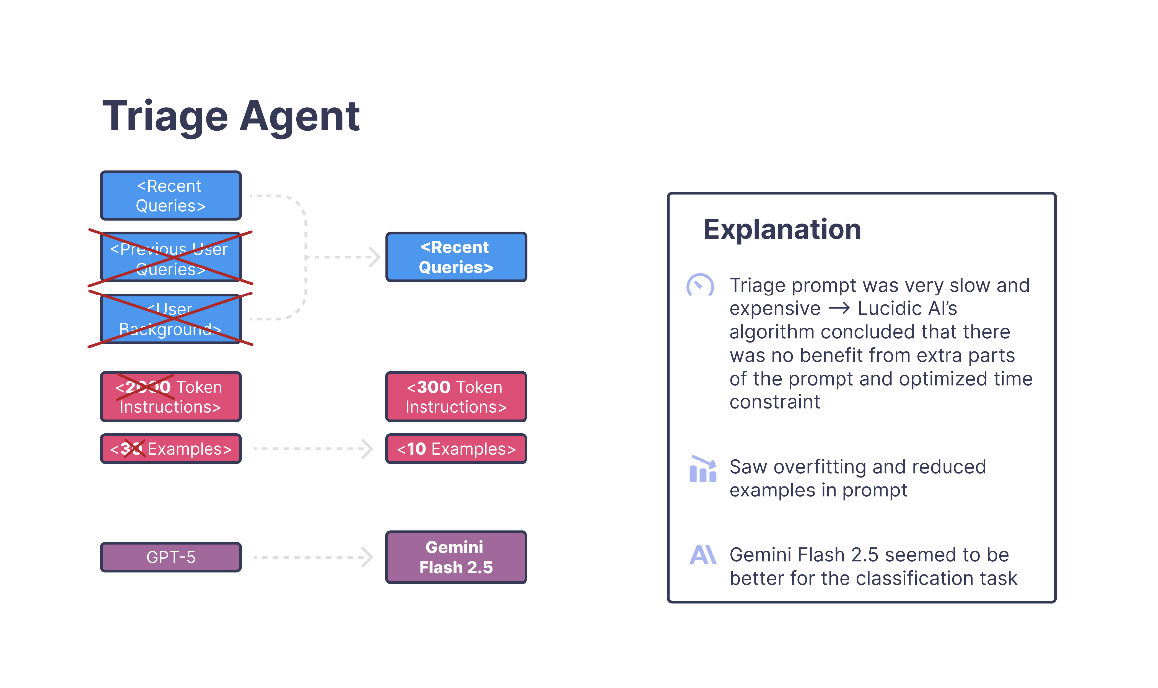 The final change came from model selection. After the prompt was trimmed down, the algorithm found that Gemini 2.5 Flash handled this shorter, cleaner structure far more reliably than the original GPT-5 setup. Once all three adjustments were applied, the triage agent stopped oscillating between classifications and this small but stubborn slice of error disappeared.